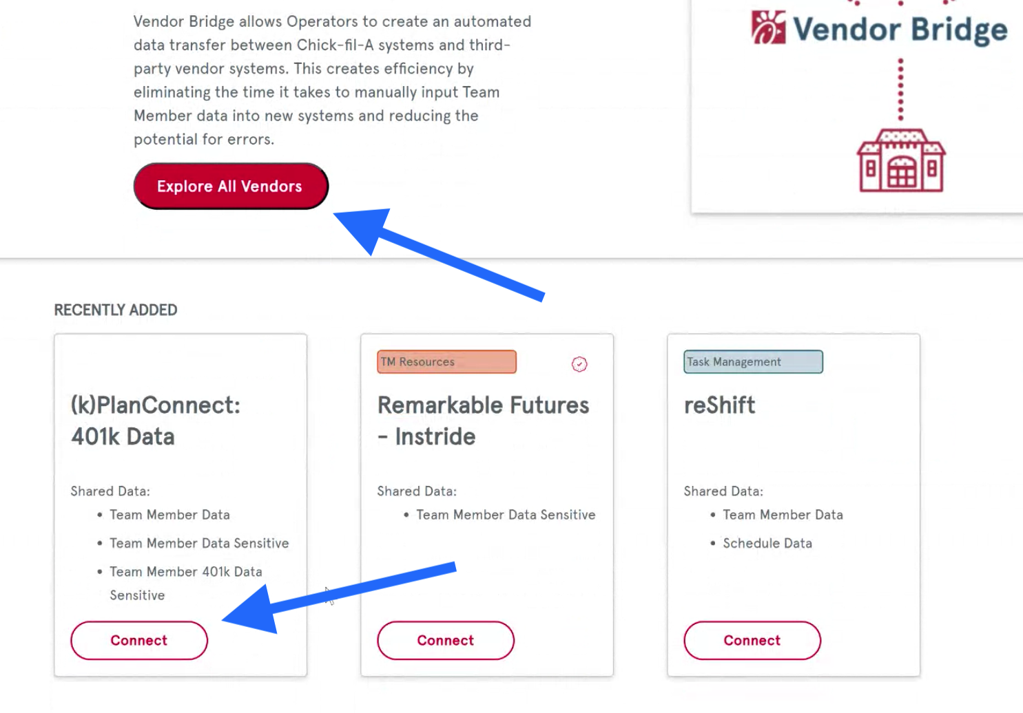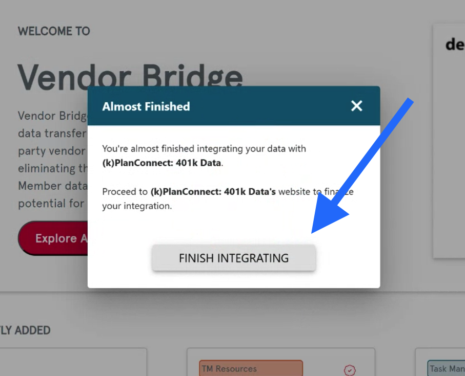 Sign in to Vendor Bridge, then find the (k)PlanConnect vendor listing, click "Connect", and follow the prompts. Here's what the whole process looks like: