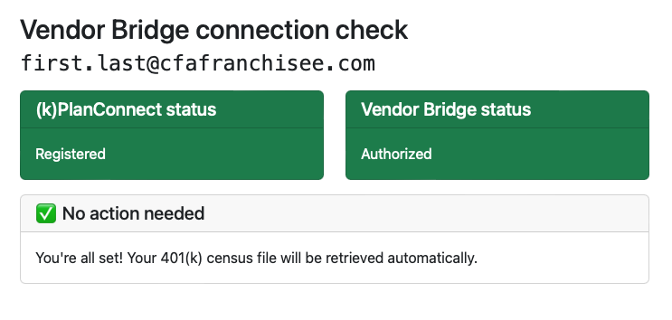 401(k) Data Shuttle uses the power of Chick-fil-A Vendor Bridge to run your 401(k) census report automatically once every pay period.